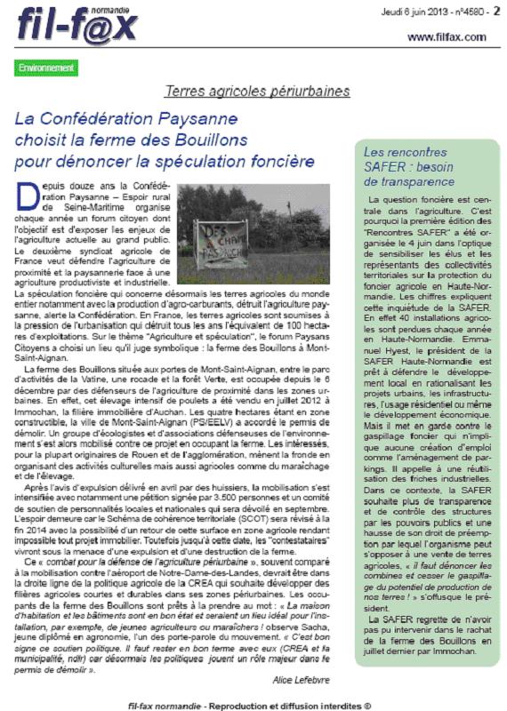 Dans la rubrique environnement du quotidien régional Fil-fax Normandie n°4580 du jeudi 6 juin, un article est consacré à la ferme des Bouillons : « Terres agricoles périurbaines – La Confédération paysanne choisit la ferme des Bouillons pour dénoncer la spéculation foncière ».
