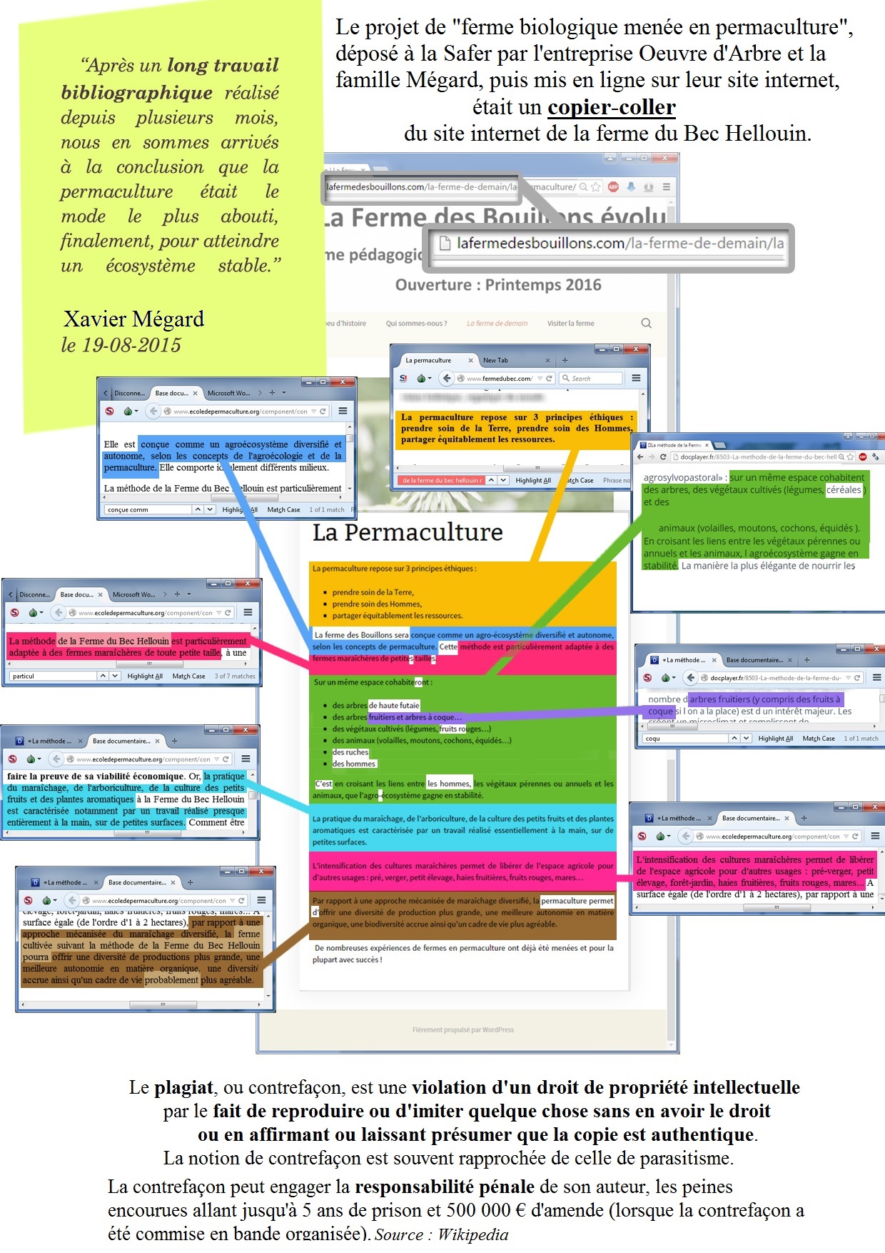 Voici ci-dessous l’illustration de cette contrefaçon, réalisé à partir d’une capture d’écran de leur site internet (cliquer sur l’image pour l’agrandir et pour zoomer). Celui-ci a été modifié peu de temps après la révélation de leur plagiat, mais leur dossier déposé à la Safer au nom de leur entreprise paysagère Œuvre d’arbres, lui ne peut plus être retouché… et gardera donc pour la postérité la trace de cette contrefaçon, de leur paresse et de leur malhonnêteté. On notera qu’ils ne gardent de la permaculture que ce qui les intéresse : ainsi, le partage équitable des récoltes a disparu de leur copier-coller.