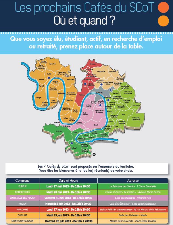 Cette rencontre fera suite à six « cafés du SCoT » qui se sont déroulés fin mai et se déroulent en juin dans l’agglomération (à Elbeuf, Bonsecours, Sotteville-lès-Rouen, Rouen, Maromme et Duclair).