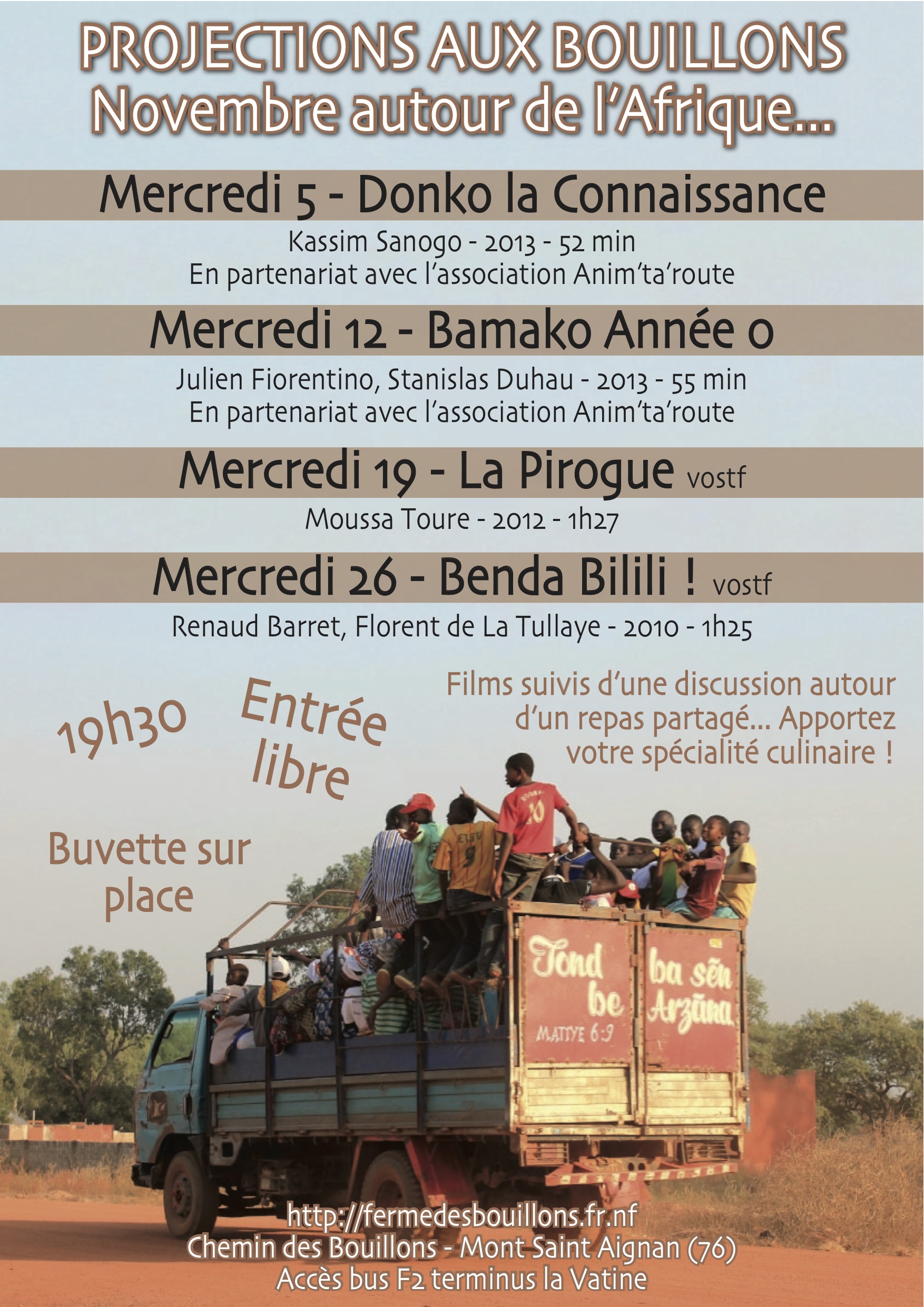 Chaque mercredi du mois de novembre, les 5, 12, 19 et 26 novembre, à 19h30, nous vous invitons à venir nombreux assister à une projection consacrée à l’Afrique à la ferme des Bouillons.