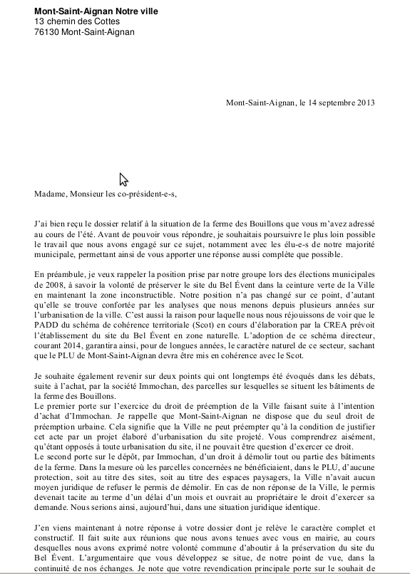 Les 4 principaux groupes politiques de la ville ont répondu au courrier accompagné d’un dossier d’une trentaine de pages (cliquez pour lire les documents du dossier) que nous leur avions envoyé durant l’été, dans lequel nous demandions la mise en œuvre d’une modification du Plan Local d’Urbanisme (PLU), afin de reclasser les terres cultivées de la ferme de « zone à urbaniser » à « zone naturelle » (voir Gazette des Bouillons n°5, septembre-octobre).