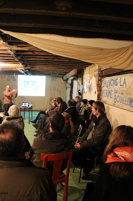 Puis une présentation de photos des vestiges et de fragments retrouvés a permis de dessiner progressivement devant nos yeux le système parcellaire de l’exploitation et le bâtiment principal de la villa antique des Bouillons, ferme gallo-romaine en activité entre le 1er et le 3e siècle après JC. Elle se situe actuellement à peu près sous l’actuel rond-point « Macdo » ou « des mobiles » D’après les récents sondages sur l’ensemble des 7 ha concernés par le projet (toujours inconnu…), peu de structures complémentaires à cette ferme sont à attendre (outre sa partie nord-ouest), mais l’ampleur des informations apportées par cette villa justifie un arrêté préfectoral pour d’autres fouilles archéologiques préventives selon un cahier des charges établi par le représentant de l’Etat.