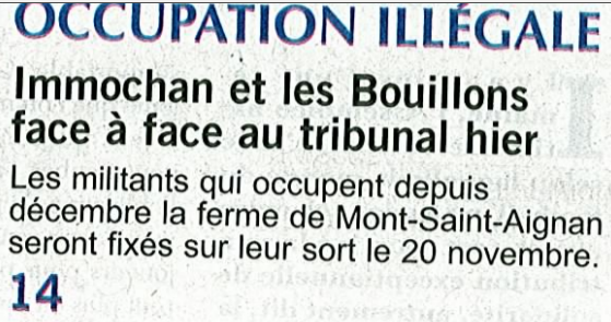 Les occupants de la ferme des Bouillons avaient reçu le 17 avril 2013 un avis d’expulsion avec commandement de quitter les lieux sous 24 heures. Cette décision avait été prise par un juge dans le cadre d’une procédure d’exception, non contradictoire, l’ordonnance sur requête.