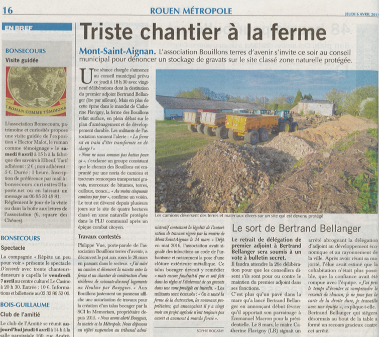 « Triste chantier à la ferme » (Paris Normandie, 6 avril 2017) Laisser un commentaire A lire, l’article paru dans le journal Paris Normandie le 6 avril - jour du conseil municipal de Mont-Saint-Aignan - informant de la transformation de la Ferme des Bouillons en décharge par la famille Mégard.
