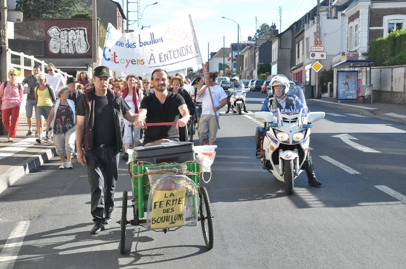 RAAF. L’objectif : obtenir une préemption de la ferme par la Safer, afin que les projets concurrents soit étudiés de manière transparente, et que le processus d’attribution final de la ferme soit équitable. Dans le même temps, nous rencontrons les services de l’Etat et les différentes collectivités locales concernées, afin qu’ils se positionnent sur le dossier, et mettons en place une opération escargot devant le Leroy-Merlin voisin pour faire entendre notre colère à la famille Mulliez. La Métropole Rouen Normandie et la Région de Haute-Normandie se positionnent pour un traitement équitable des dossiers, donc pour une préemption. Chacun de ces rendez-vous est l’occasion de rassemblements suivis, chose inouïe en plein mois d’août, ainsi que le souligne à plusieurs reprises la presse locale.